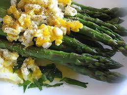 Steam Asparagus on stove top... top with shredded or chopped hard boiled eggs and salt and pepper.
